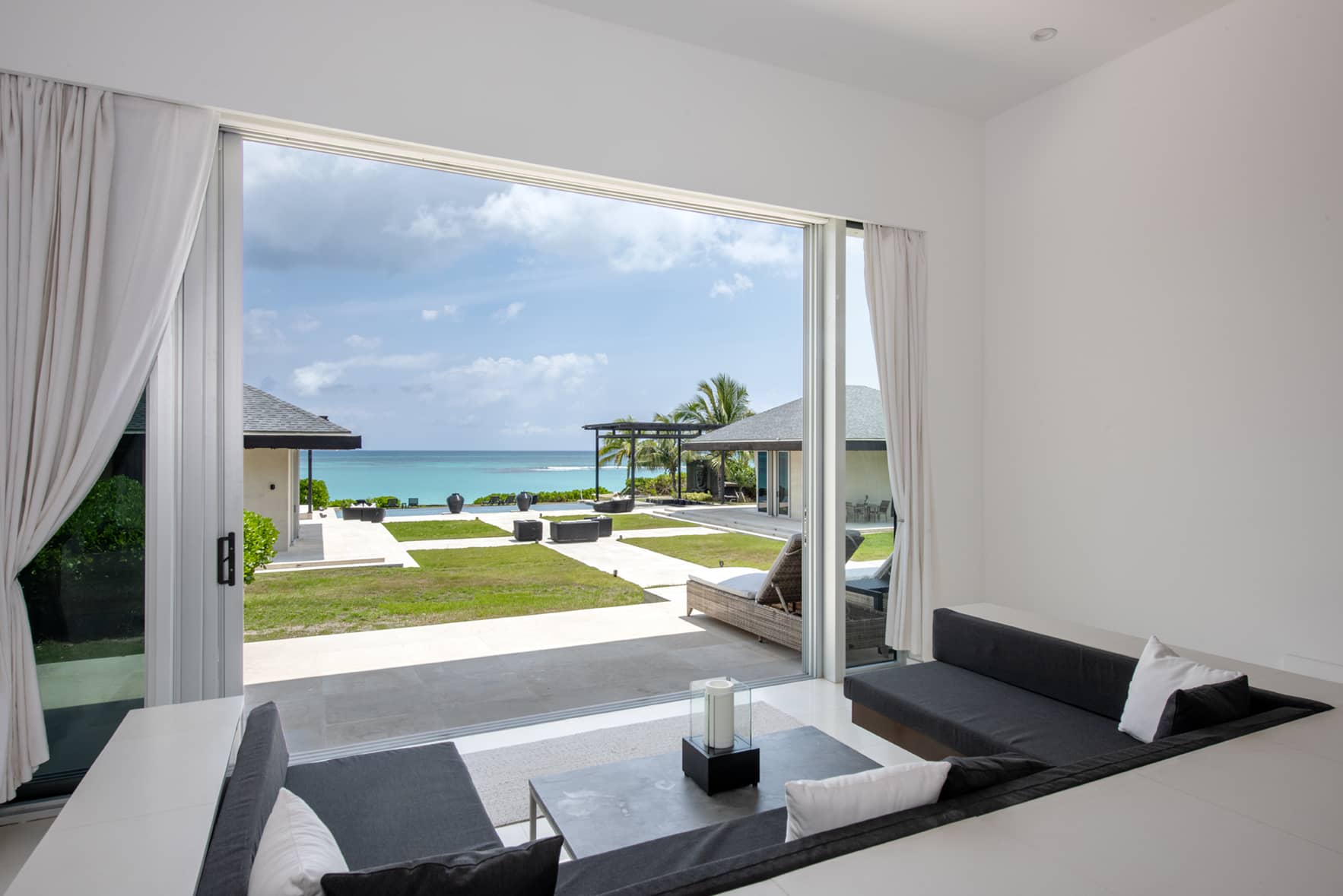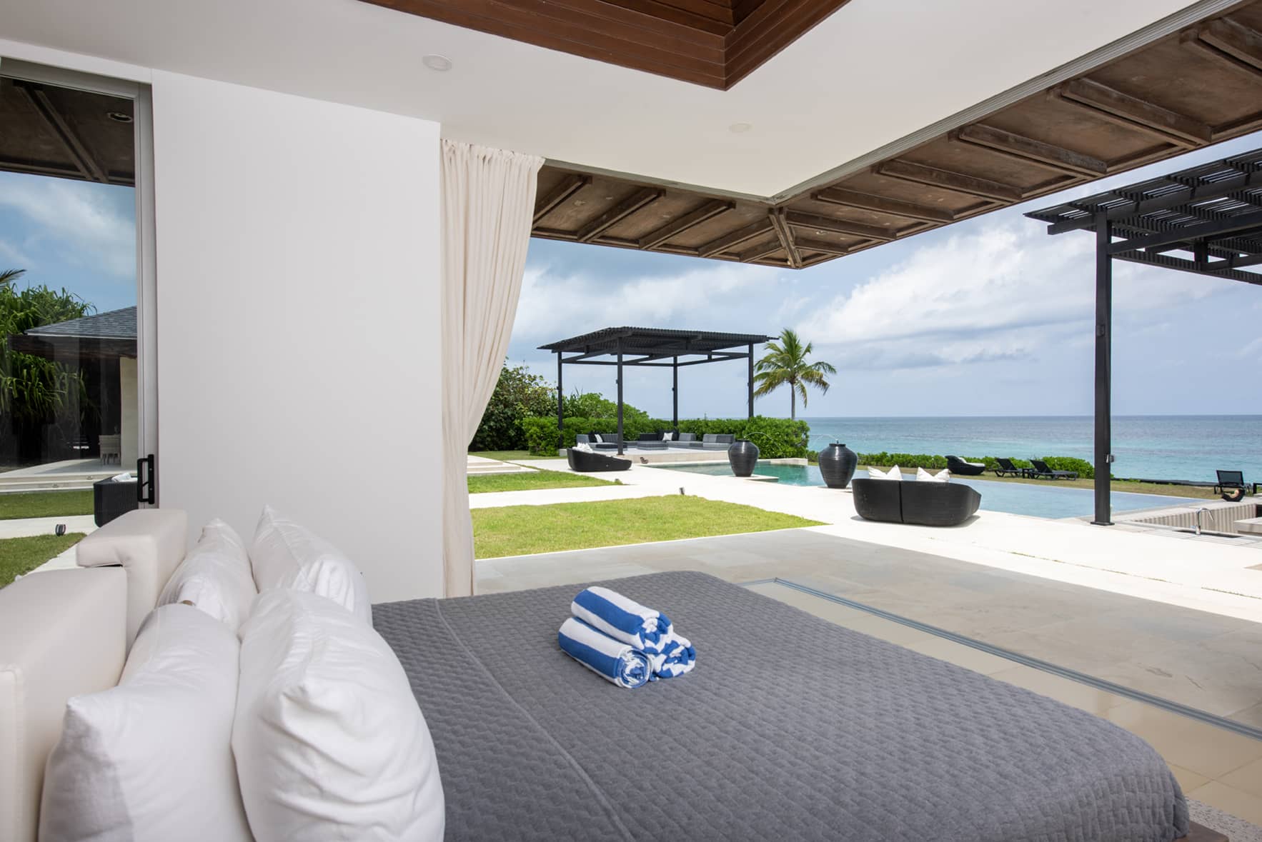 This living area is flanked by two magnificent master bedroom suites with 20-foot vaulted ceilings. Each suite has a wall of glass with a sweeping view of the ocean. Amenities include 55-inch 4k 3D TV. The ultra-luxury bathrooms feature Caesar stone and Carrara White slab walls and floors, top-of-the-line Hansgrohe Axor fixtures, and stand-alone tubs carved of solid Carrara marble. The bedrooms are furnished with Italian furniture.These main house bedrooms each include a lower built-in area for lounging or for use as additional sleeping quarters. There is also a rollaway bed available for a 9th guest.