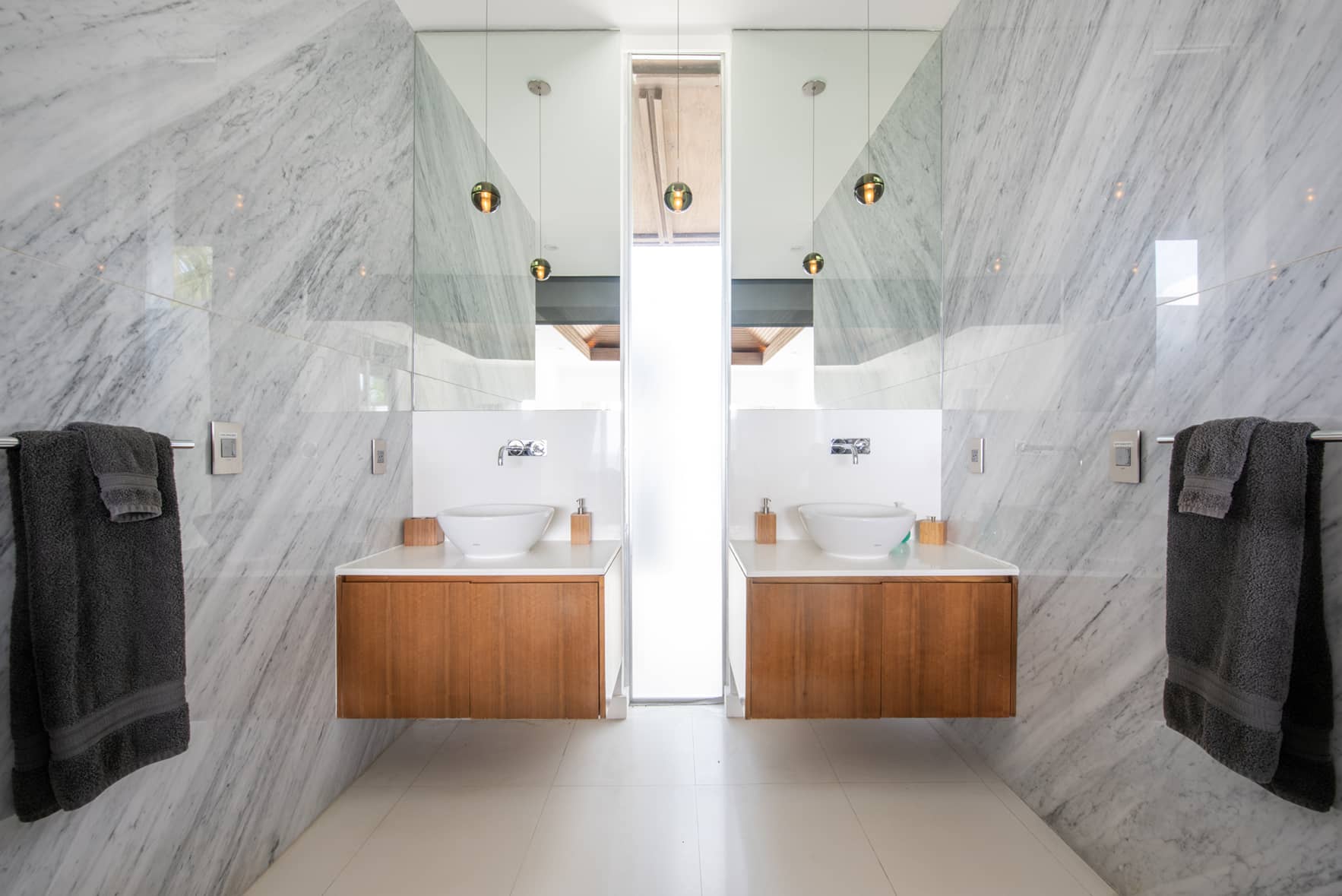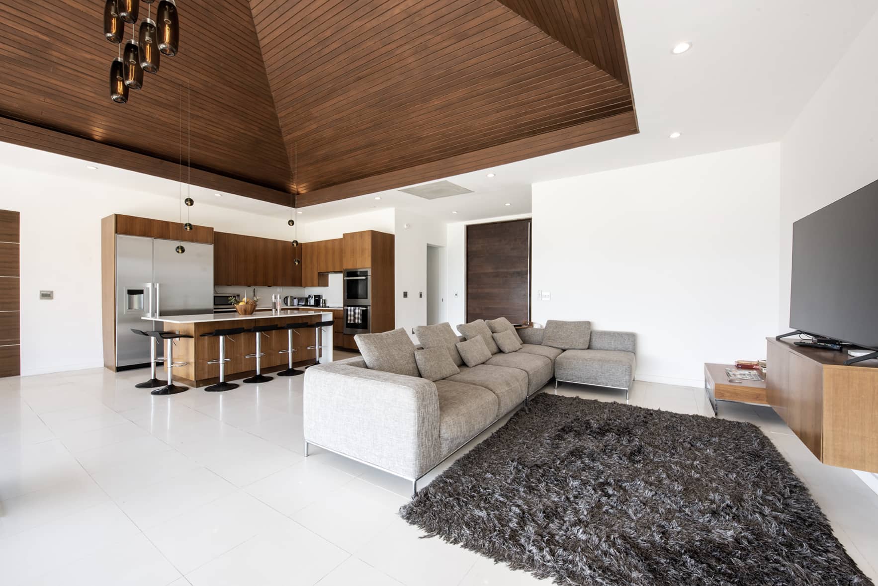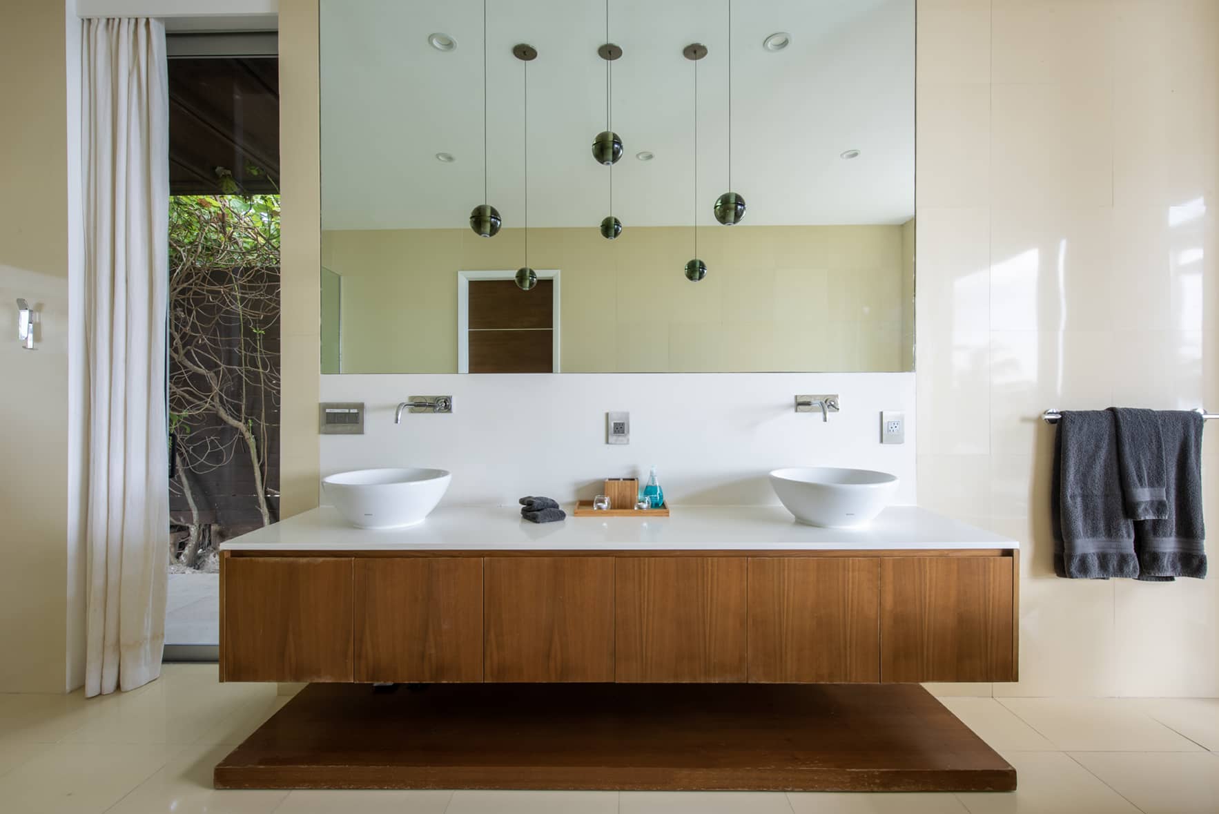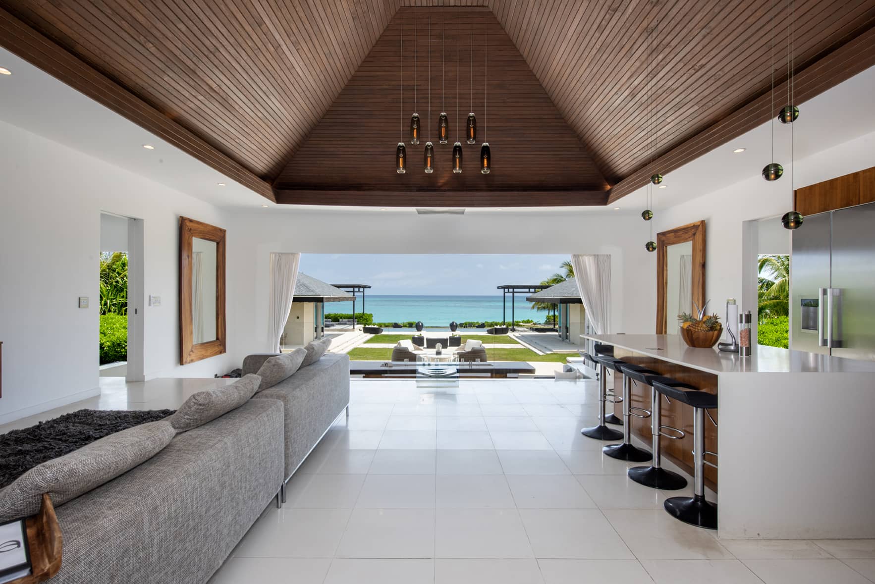 Entering the main house through the 10 x 6’ wide swinging Balinese doorway, you are greeted by a Caesar-stone gallery with a fully retractable wall of glass facing the ocean on the other side. The open kitchen, to your right, features top of the line Miele appliances including a 36’’refrigerator, Master Chef double oven, and glass cooktop with retractable hood. The kitchen is fully equipped with professional grade juicer, blender, Nespresso coffee machine, hotel grade cutlery, and dining ware by Fortessa.