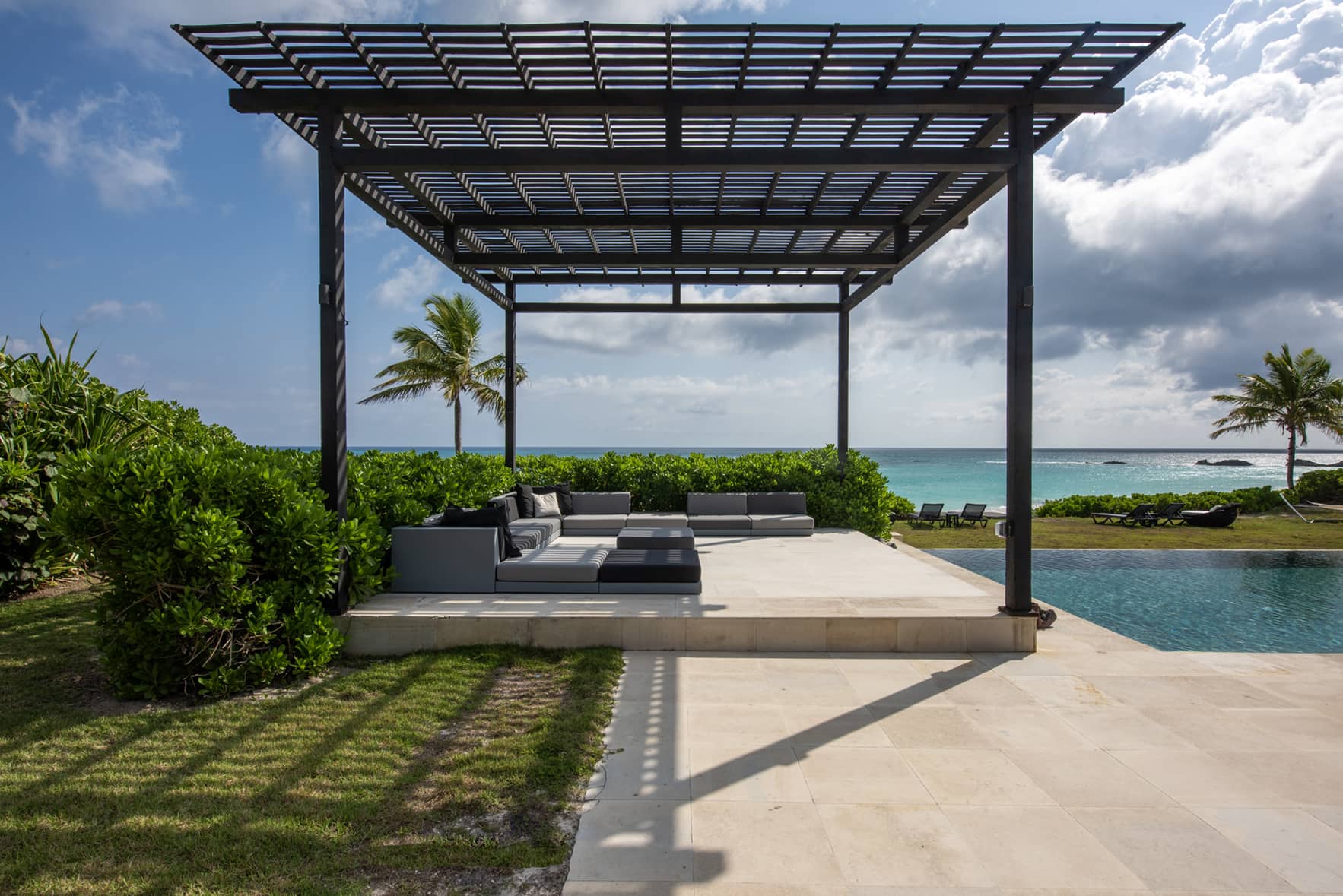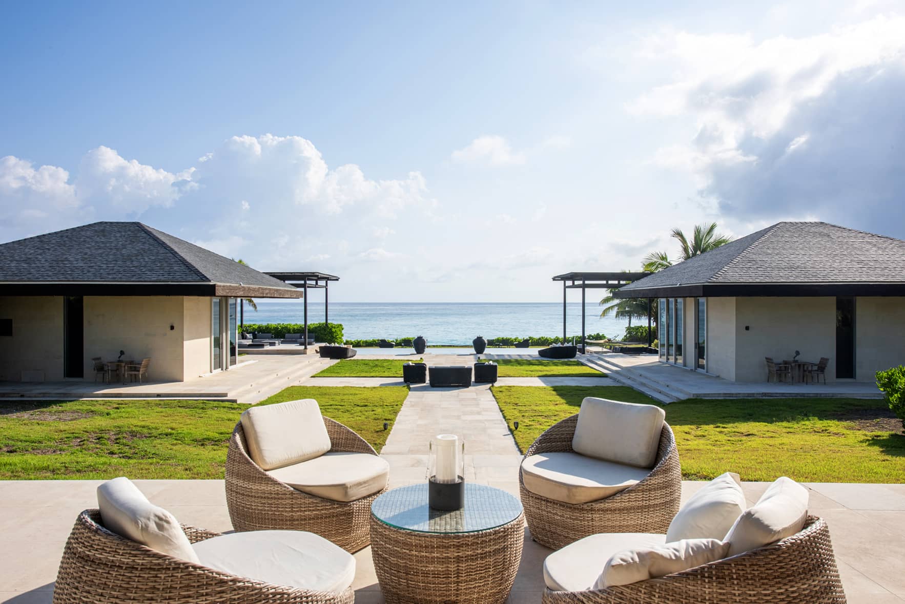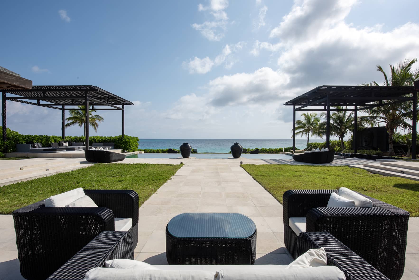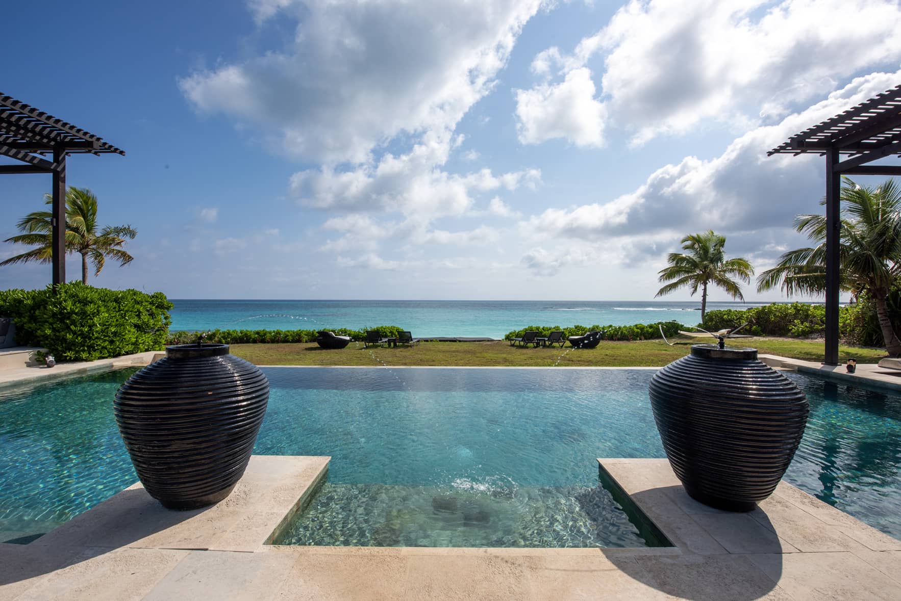 The Ananda Estate consists of a two-bedroom main house and two detached pavilions. The three houses are set around a courtyard. The centerpiece of the courtyard is a 50 x 20 foot oceanfront infinity pool. It is flanked on one side by a vast 400-square-foot sitting area beautifully appointed with new outdoor furniture, and on the other side by a swim-up bar, a sitting area, and an outdoor kitchen equipped with an electric grill. There is also a gas grill on the terrace. A 12 x 8 foot Zen-inspired Buddha water fountain imported from Bali overlooks this magnificent pool area and bestows its serenity on the courtyard
